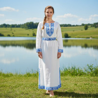 Льняная женская рубаха с коротким втачным рукавом, прекрасно подойдет для проведения традиционных славянских праздников и выступлений. По вороту, низу изделия, рукавам расположен декор из жаккардовой тесьмы с обережным рисунком. Модель комплектуется кушаком (поясом) из ткани с тесьмой.