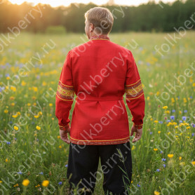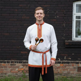 Фасон рубахи удобен и не ограничивает движения. Жесткий воротник, пуговицы отсутствуют, рукав втачной, немного спущенный, свободный, длина рукава примерно до локтя. По бокам внизу разрезы. К рубахе прилагается пояс. Декор на груди выполнен из жаккардовой тесьмы в натуральном цвете. Для подбора правильного размера, в заказе, пожалуйста, пишите рост, обхват груди и талии.