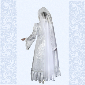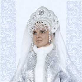 Красивый карнавальный костюм может создать образ Снегурочки, или Снежной королевы, или Зимушки в зависимости от пожеланий его обладательницы. Шубка выполненная из белой парчи с серебристым мерцающим узором (напоминающим ледяные узоры на окнах зимой), украшенная белым искусственным мехом и тесьмой с люрексом. Удобный и универсальный фасон, с регулируемой кулиской по талии, потайной застежкой, расклешеными рукавами.