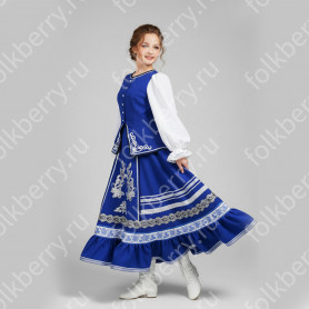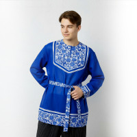Косоворотка украшена жаккардовой тесьмой и вьюнком, контрастирующей по цвету с основной тканью. В комплекте с изделием идет кушак.