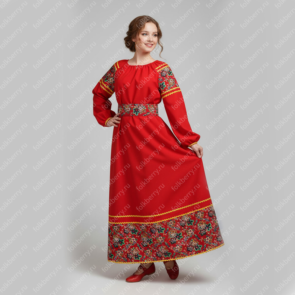Платье «Полюшко» изготовлено из белого льна. Декорировано жаккардовой тесьмой с цветочными узорами в русском стиле. Декор собирается профессиональным дизайнером из жаккардовой тесьмы, вьюнка, бархотки с учетом цвета и рисунка текстильных материалов.  Платье хорошо сядет на разные типы женской фигуры. Свободного А-силуэт, рукав реглан, регулируемая горловина способствуют удачной посадке. Талию удачно подчеркивает широкий декорированный пояс. Его также можно использовать с другими вещами ( например, белой блузой).