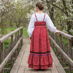 Платье «Солдатка» отрезное по талии, рукав реглан, юбка-почти солнце, длиной немного ниже колена. В комплект входит пояс. Важно, что декор платья выдержан в славянском стиле. Это платье - современное прочтение народных традиций. Женственное, удобное и нарядное, оно дарит ощущение радости и праздника. По стилю замечательно подходит для тематических праздников в детских учебных заведениях, по фасону и яркости цветов отлично подойдет для танцевальных коллективов. как правило, дети не стесняются надевать его ( в отличии от длинного русского сарафана ) Платье выполнено из немнущейся, матовой ткани "габардин" символичных для славян цветов ( красного, синего, зеленого, бордового).