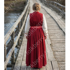Юбка сшита из ажурного шитья, состоит из трех прямоугольных полотен, соединенных на поясе, украшена красным кружевом, бархоткой в тон, а также блестящей серебристой тесьмой.