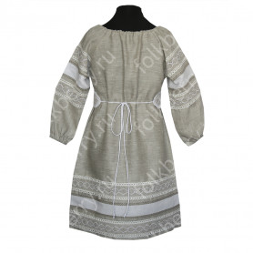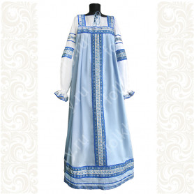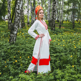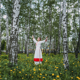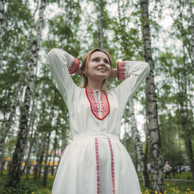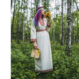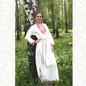 Рубаха женская "Славянская" удобная, красивая одежда, которая прошла проверку временем, потому что носили их женщины и девушки с незапамятных времен. Длинную рубаху надевали с сарафаном, с юбкой-поневой, с фартуком или носили отдельно как самостоятельный наряд. Рубаха с поликами, длинная, по бокам разрезы 30-40 см, выполнена из небеленого или белого льна, украшена декоративной тканной лентой шириной 5 см, с поясом в цвет декора. Для усиления образа, можно с рубахой надевать славянский традиционный тканный пояс и очелье ( повязка на голову)