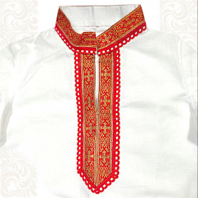 Рубаха "Василёк" выполнена из габардина белого оптического цвета. Декором косоворотки стали большие по размеру вставки из хлопка с цветочным рисунком в сине-голубом цвете и вьюн синего цвета. С Косоворотка без воротника-стойки удобна при надевании на верхнюю одежду (на зимних мероприятиях). Косоворотка "Василек" и сарафан с блузой "Гжель" подойдут для участников одного ансамбля.