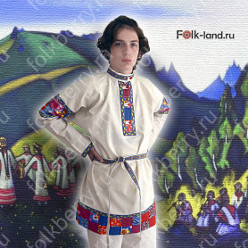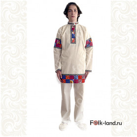 Мужская рубаха «Истоки» выполнена из хбелого льна, имеет втачной рукав. По низу изделия, вороту и рукавам расположена жаккардовая тесьма с обережным рисунком. Дополняет рубаху кушак (пояс) из ткани с тесьмой.