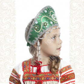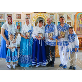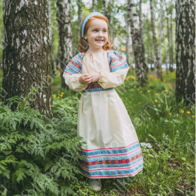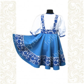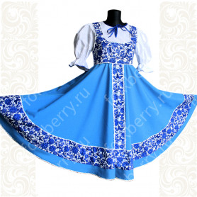 Приталенная модель хорошо сидит по фигуре, расклешенная книзу дает крупные мягкие волны. Сзади расположена застежка «молния». Талия дополнительно подчеркивается поясом. Плечики регулируются по длине. Сарафан украшен широкой полосой из жаккардовой тесьмы, вьюнка, золотистого шнура, кружева.