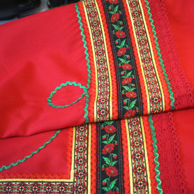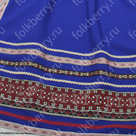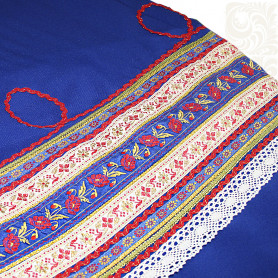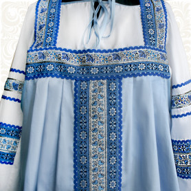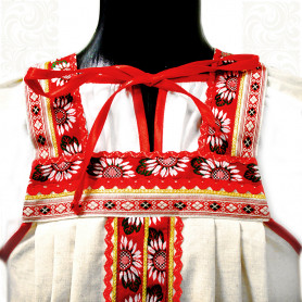 Сарафан декорирован широкой полосой  жаккардовой тесьмы, золотистого шнура, вьюнка, кружева, что придает изделию дополнительные шик и торжественность.