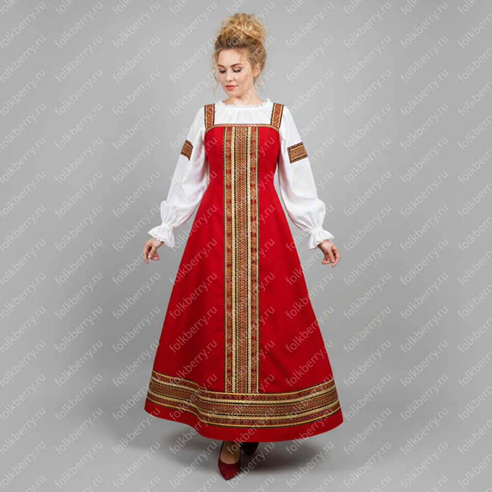 Сарафан с блузой «Марья да Иван» выполнен в красном цвете в традиционном русском стиле. Плотный матовый габардин не мнется, не блестит под софитами.