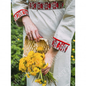 Сарафан длинный, выполнен из яркого габардина и расшит жаккардовой тесьмой и «вьюнком», которые эффектно смотрятся на основной ткани.