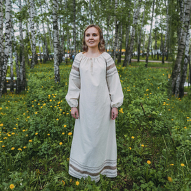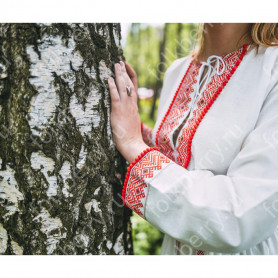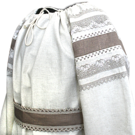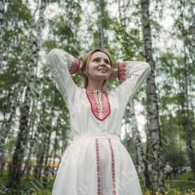Блуза сшита из воздушной невесомой ткани – крепдешина. По индивидуальному заказу могут быть выбраны также атлас или шелк. Рукава пышные, на запястье воланы. Белоснежная блуза отлично сочетается с ярким сарафаном.