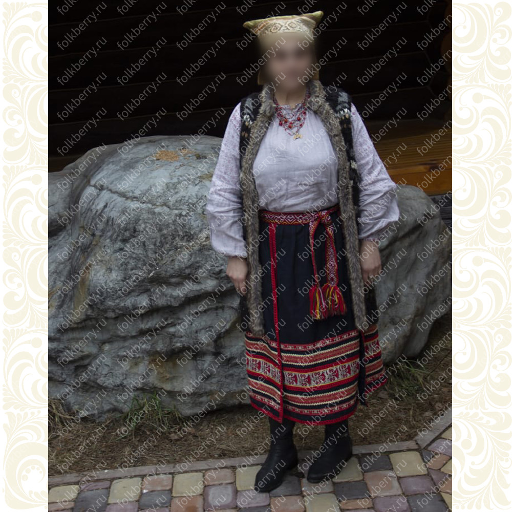 Характерное отличие поневы от любой другой юбки в том, что она обычно изготавливается из трех кусков ткани прямоугольной формы, собранных на общем поясе. Понева выполнена изо льна черного цвета. Каждая часть поневы декорирована жаккардовой тесьмой и вьюнами внизу и по примеру. Примечательно, что широкая тесьма с цветочным узором, выполнена на основе исторического изображения, см. фото. Как правило, поневу надевают на длинную рубаху и подпоясывают тканым славянским поясом или поясом-шнурком.