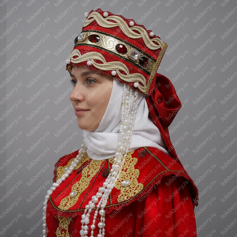 3. Кокошник выполнен из парчи, кружева, страз. К кокошнику прилагаются полупрозрачная фата и длинные бусы-подвески. Высота кокошника 13 см. Сзади ленты-крылья. Кокошник легкий и удобный.
