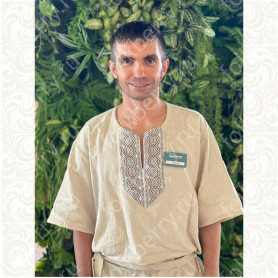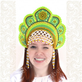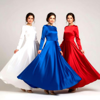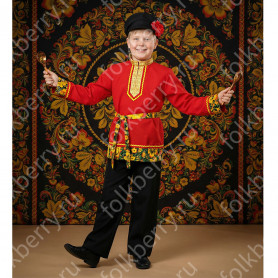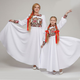 Костюм выполнен из габардина и красиво подобранного декора в золотистых цветах. Достоинства габардина в том, что он не мнется, не блестит, как атлас, ложится красивыми мягкими складками, цвет не выгорает. Юбка с оборкой, декор в золотистых цветах, по талии на двойной резинке. Блуза белого праздничного цвета, с баской, рукава расширены внизу, с манжетами. Сзади на блузе шнуровка. Она дает хорошую посадку по фигуре. Костюм предназначен для творческих сольных и коллективных театральных выступлений.