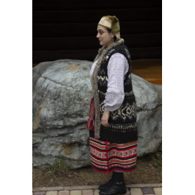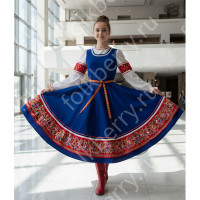 Костюм выполнен из габардина и красиво подобранного декора в золотистых цветах. Достоинства габардина в том, что он не мнется, не блестит, как атлас, ложится красивыми мягкими складками, цвет не выгорает. Юбка с оборкой, декор в золотистых цветах, по талии на двойной резинке. Блуза белого праздничного цвета, с баской, рукава расширены внизу, с манжетами. Сзади на блузе шнуровка. Она дает хорошую посадку по фигуре. Костюм предназначен для творческих сольных и коллективных театральных выступлений.